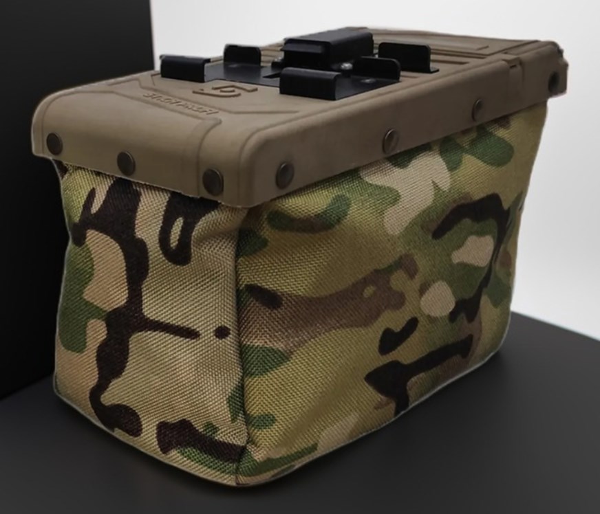 Конструктивно, короб состоит из двух деталей – пластиковой верхней крышки, обеспечивающей подачу ленты и фиксацию короба к пулемёту (все необходимые основные узлы выполнены из металла) и текстильной основной части, выполненной из синтетической ткани плотностью 1000D (100% Nylon). Для размещения внутри короба ленты, основная часть короба оборудована молнией – расстегнув молнию, через образовавшееся отверстие можно легко и просто уложить ленту необходимой длины (ёмкость короба – 100 патронов). Кроме того, текстильная часть короба дополнительно оснащена панелью Velcro для фиксации патчей, что позволит дополнительно персонализировать Ваше оружие.