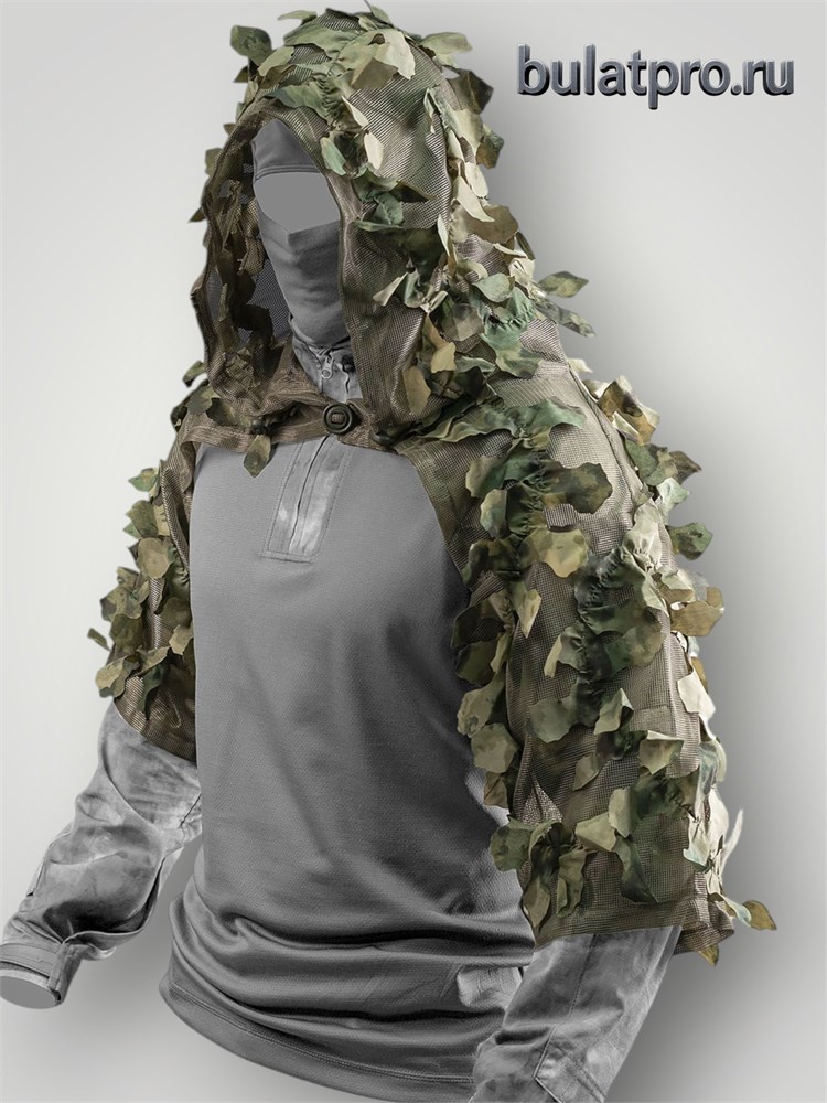 - прозрачная (не мешает обзору и ориентации) сетка для лица, интегрированная в капюшон, предохраняющая от насекомых и улучшающая маскировку пользователя - скрывает светлую, выделяющуюся кожу лица и выделяющиеся контуры лица (избавляет от необходимости использования грима);