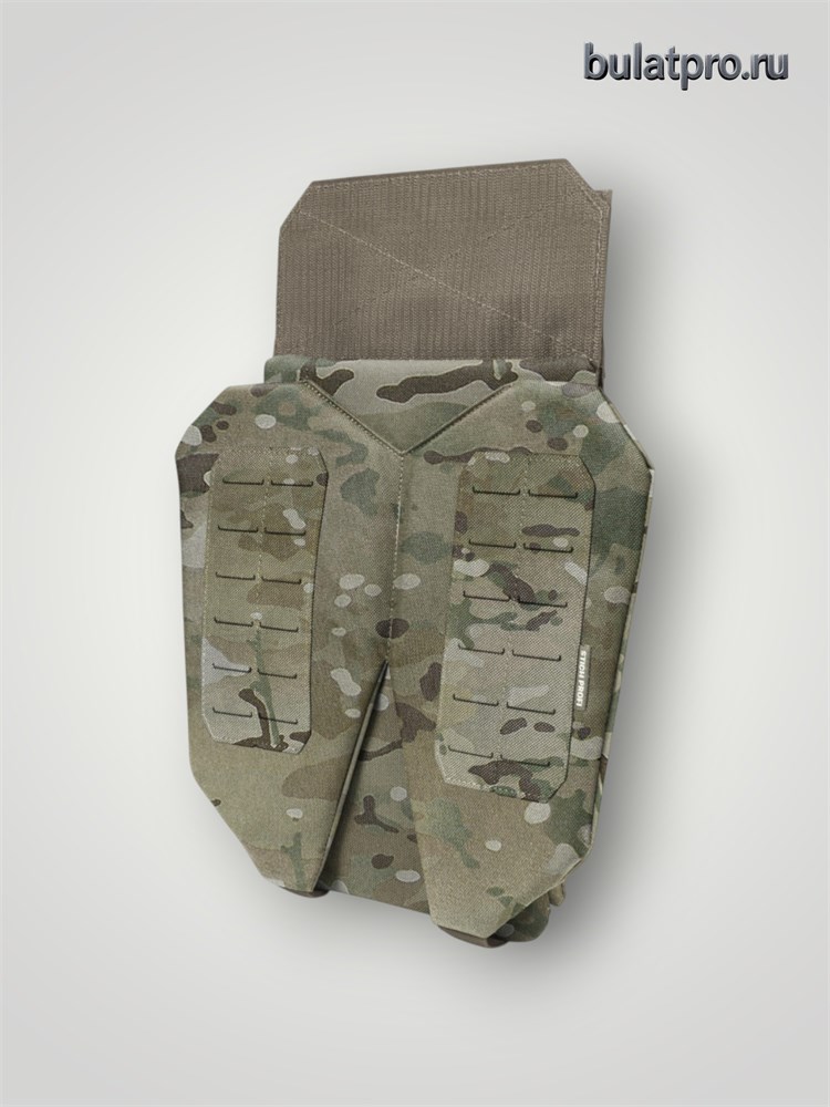 Трехлепестковый напашник с дополнительным четвертым элементом защиты по высоте. Напашник устанавливается с помощью липучки Велкро на фронтальной части бронежилета, щита, плитника и защищает паховую зону от осколков. Данная модель напашника состоит из четырех элементов, благодаря этому при смене положения тела напашник не поднимается и не задирается. При положении человека сидя или в изготовке стоя - центральный, нижний и боковые элементы продолжают защищать жизненно важные части паховой зоны.