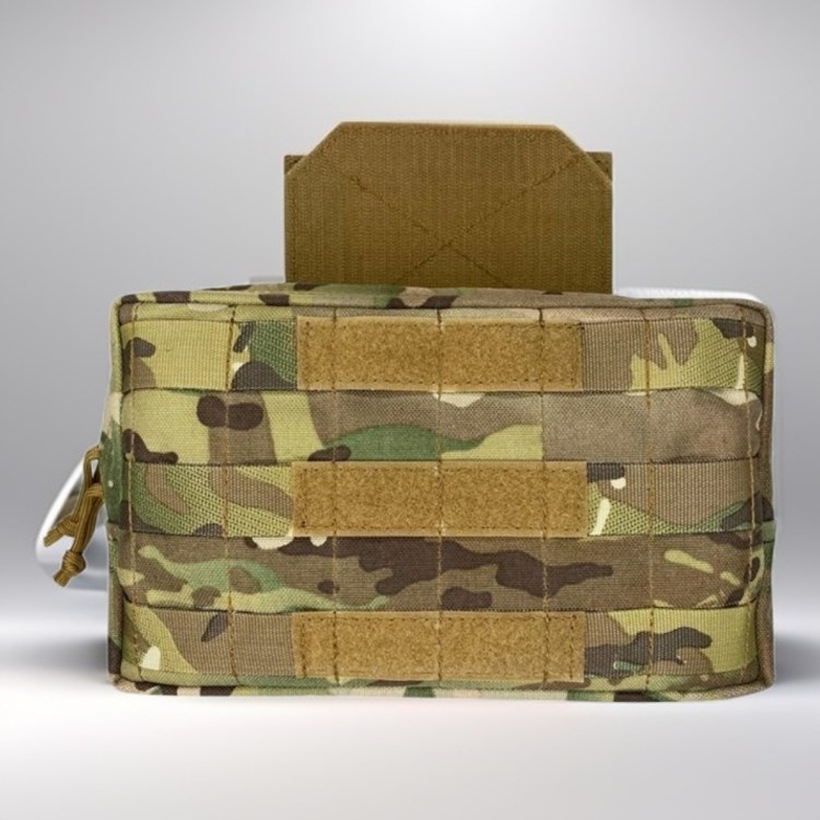 На передней части подсумка присутствуют ячейки Molle и велкро для закрепления патчей, опознавательных знаков. Внизу подсумка люверс для стока жидкости.