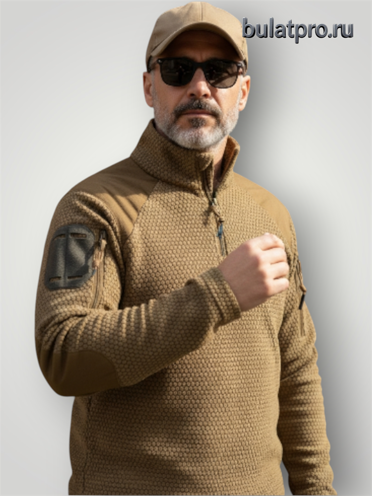 Флисовая кофта, сделанная из качественного и износостойкого флиса, устойчивого к скатыванию. Оснащена на рукаве карманом на молнии, двумя велкро панелями по обеим сторонам рук, воротник имеет стойку для защиты от ветра. Удобный крой и качество материалов и фурнитуры делают эту кофту повседневной и практичной одеждой. Локти и плечи усилены дополнительной защитой от износа. Материал: 100% полиэстер