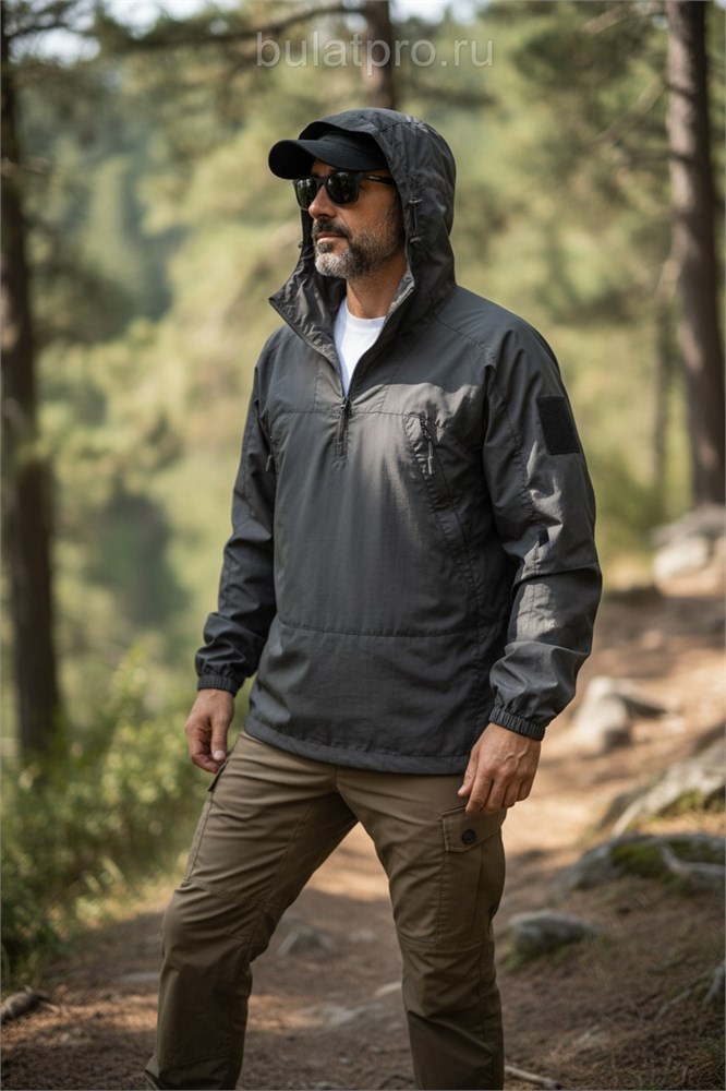 Анорак предназначен для спорта и туризма. Хорошо защитит от ветра и умеренных осадков.