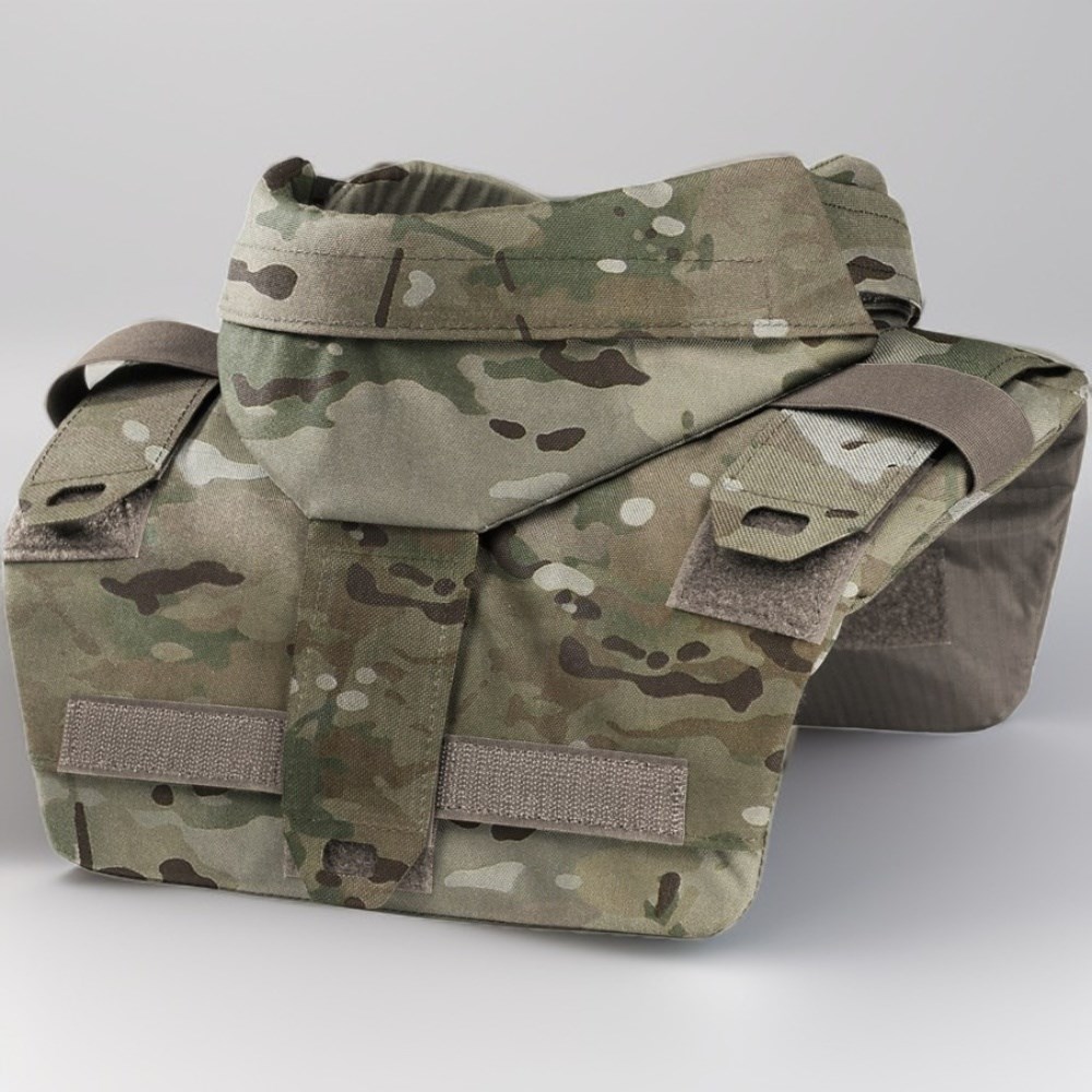 Ворот-манишка с комплектом противопульной и противоосколочной защиты, предназначен для защиты шейного отдела от поражающих элементов в виде осколка. Ворот состоит из чехла выполненного из материала нейлон плотностью 1000D и противоосколочного пакета. Данный пакет выполнен из современного баллистического материала СВМПЭ. В ходе проводимых сертификационных испытаний показал высокий результат V50% непробития поражающих элементов не менее – 550 м/с.