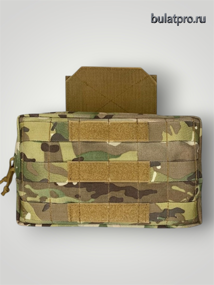 На передней части подсумка присутствуют ячейки Molle и велкро для закрепления патчей, опознавательных знаков. Внизу подсумка люверс для стока жидкости.