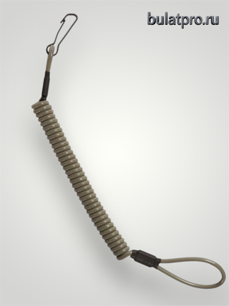 – металл (центральная жила, карабин, обжимные кольца).Конструктивные особенности:В сравнении с традиционными (кожаными, синтетическими) пистолетными тренчиками фиксированной длины, витой пистолетный шнур пружинного типа максимально компактен: в позиции «оружие в кобуре» его длина не превышает 12 см. Малые размеры шнура, во-первых, затрудняют его захват с целью завладения оружием кем-либо посторонним, во-вторых, сводят к минимуму вероятность случайных зацепов за внешние предметы при любом виде передвижения. Кроме того, круглое сечение и упругость материала не позволяют шнуру зацепиться за элементы собственного снаряжения при экстренном извлечении пистолета: гладкая пластиковая спираль легко «скатывается» с любых выступов амуниции. Стальная стержневая жила обеспечивает прочность шнура на разрыв: гарантия прочности при рывке – не менее 20 кг, при растягивании – втрое больше; а также приводит шнур в исходное «сжатое» положение при возвращении оружия в кобуру. Конструкция крепежных элементов – мягкая петля и металлический карабин – исключает возможность случайного расстегивания: в стандартном варианте петля фиксируется на поясном ремне, карабин – на антабке пистолета. Длина шнура в растянутом состоянии точно соответствует расстоянию от места его фиксации на поясном ремне до рукояти пистолета, практически без провисания, вне зависимости от антропометрических данных владельца. Материал шнура принципиально исключает снижение прочности, растяжение вследствие размокания, или деформацию, потерю эластичности в результате пересыхания.
